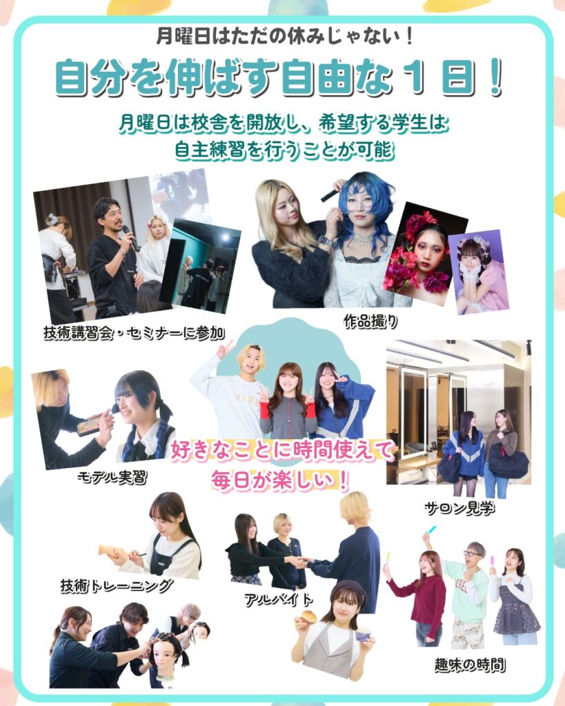 ・技術セミナー ・作品撮り📸 ・モデル実習 ・技術トレーニング ・サロン見学 ・アルバイト ・趣味の時間
